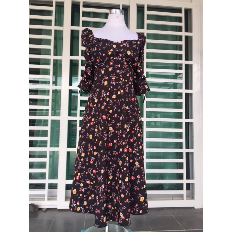Gaun lengan puff sifon bunga hitam gaun maxi kerah persegi elegan cantik .